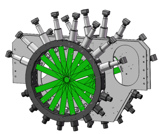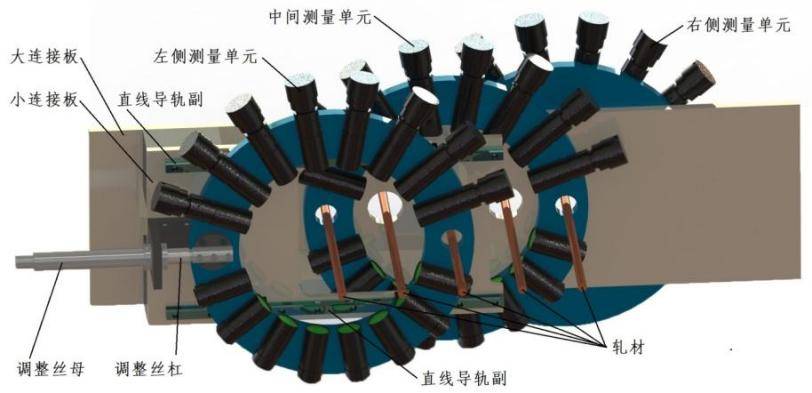 为了避免相邻轧材遮挡、干扰测头测量,测头的分布不能均匀分布,处于轧材两侧的测头间角度增加至40°,其余测头间的角度为20°。
