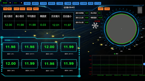 实时显示管材长度变化,最大最小值和超差尺寸在管材的具体位置,光标移动到相应位置即可显示;实时显示测量数据动态趋势。
